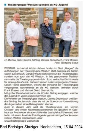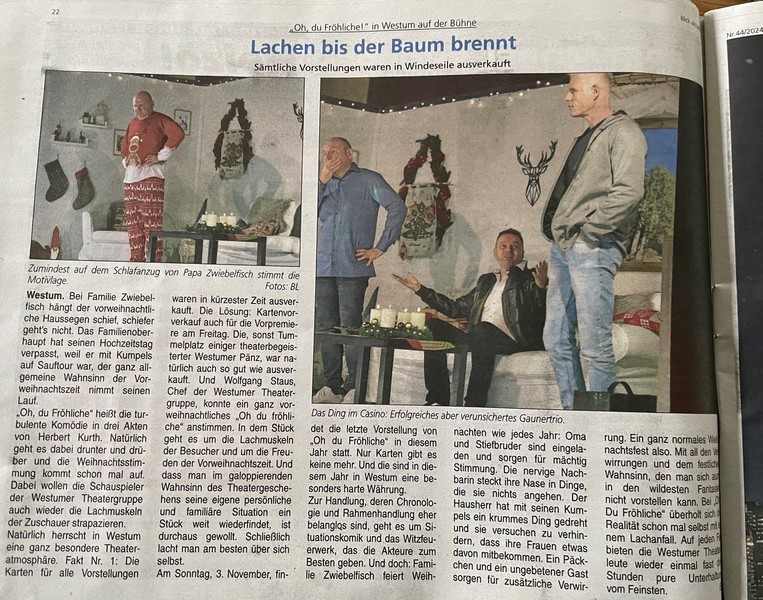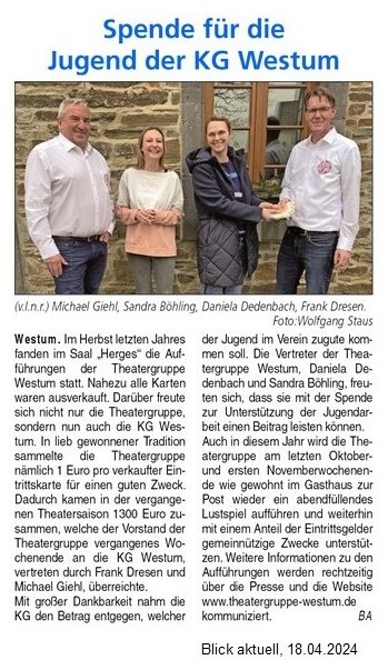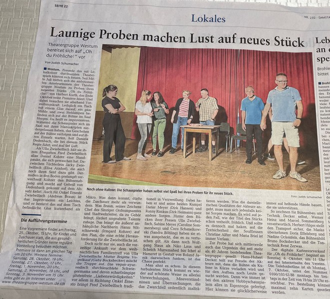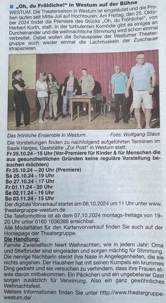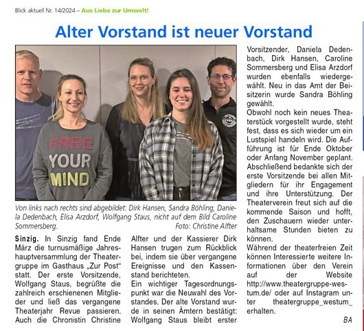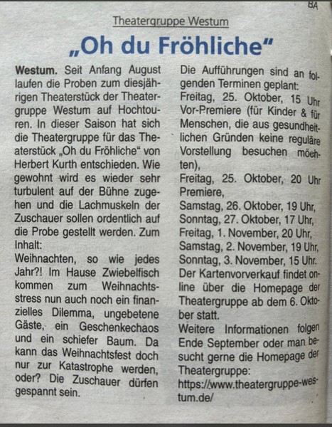 Wer sich während der theaterfreien Zeit über den Verein informieren möchte, kann dies hier auf der Website unter http://www.theatergruppe-westum.de/ oder auf Instagram unter theatergruppe_westum_ tun.