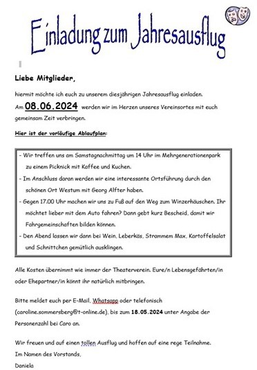 Ein neues Theaterstück konnte zwar noch nicht vorgestellt werden, aber fest steht, dass es wieder ein Lustspiel sein wird, welches voraussichtlich Ende Oktober/ Anfang November aufgeführt werden soll. Zum Schluss bedankte sich der erste Vorsitzende bei allen Mitgliedern für ihr Kommen und ihre Unterstützung. Der Theaterverein freut sich auf die kommende Saison und hofft, den Zuschauern wieder ein paar amüsante Stunden bereiten zu können.