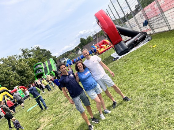 Strahlende Kinderaugen und glückliche Veranstalter – das erste Westumer Kinderfestival am Pfingstsamstag war trotz durchwachsenem Wetter ein großer Erfolg. Zahlreiche Familien waren der Einladung gefolgt, kostenfrei verschiedene Hüpfburgen zu bespielen, beim Human Kicker selbst als Kickerfigur zu agieren oder mit großen, aufgeblasenen Kugeln über den Sportplatz zu rollen und Bubble Soccer zu spielen.