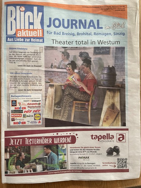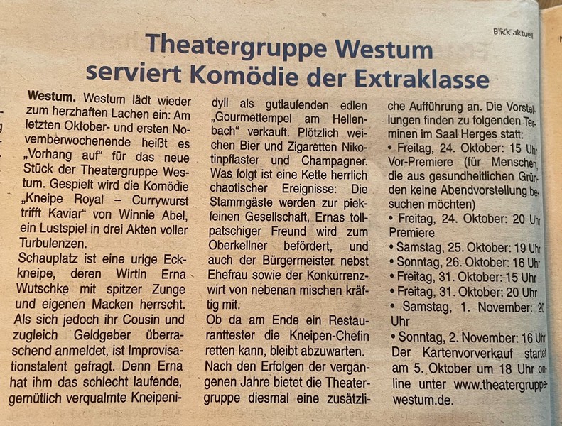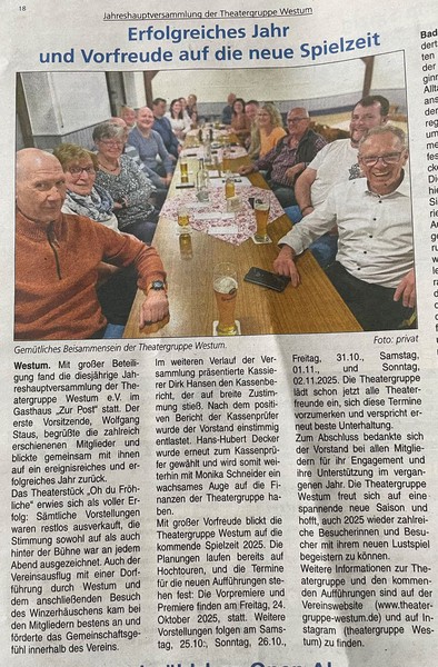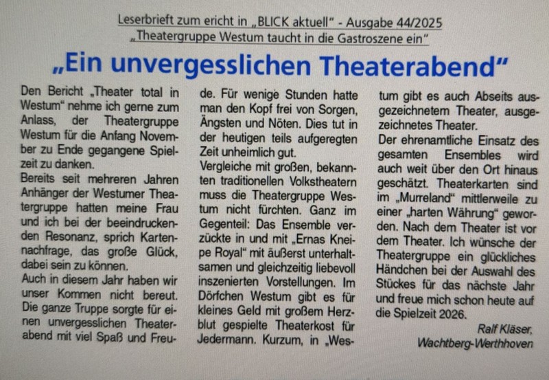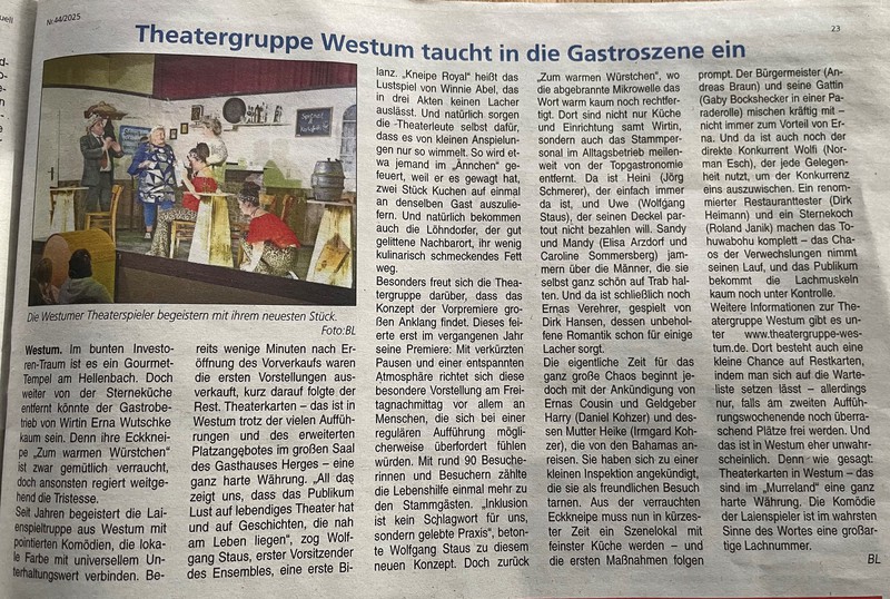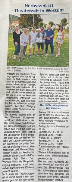 Weitere Informationen zur Theatergruppe und den kommenden Aufführungen sind auf der Vereinswebsite (www.theatergruppe-westum.de) und auf Instagram (theatergruppe Westum) zu finden.