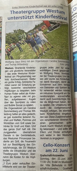 Die Umsetzung wird durch die Dorfgemeinschaft Westum erfolgen, die ebenfalls beim Kinderfestival eingebunden war. Diese Zusammenarbeit von verschiedenen Vereinen für einen gemeinsamen guten Zweck macht Westum einzigartig liebenswert – und sollte alle Eltern und Kinder ermutigen, sich weiter in den Westumer Vereinen zu engagieren.