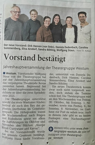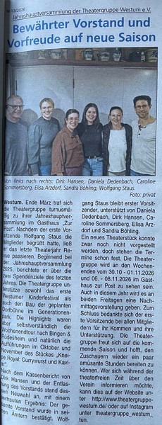Ende März traf sich die Theatergruppe turnusmäßig zu ihrer Jahreshauptversammlung im Gasthaus "Zur Post". Nachdem der erste Vorsitzende Wolfgang Staus die Mitglieder begrüßt hatte, ließ er das letzte Theaterjahr Revue passieren. Beginnend bei der Jahreshauptversammlung 2025, berichtete er über die zwei Spendenziele des letzten Jahres. Die Theatergruppe unterstützte sowohl das erste Westumer Kinderfestival als auch den Bau der geplanten Dorfbühne im Generationenpark. Die Highlights waren aber selbstverständlich die Wochenendtour nach Bingen und Rüdesheim und natürlich die Aufführungen im Oktober und November des Stückes: "Kneipe Royal: Kaviar trifft Currywurst".